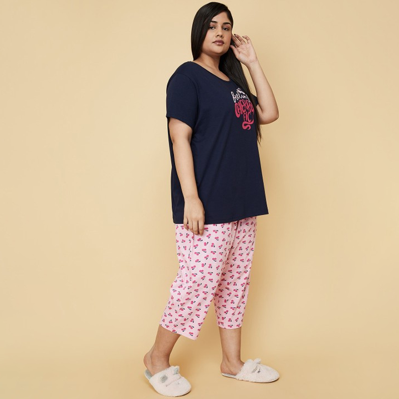 Women Plus Size Navy Blue & Pink Printed Pure Cotton Night suit